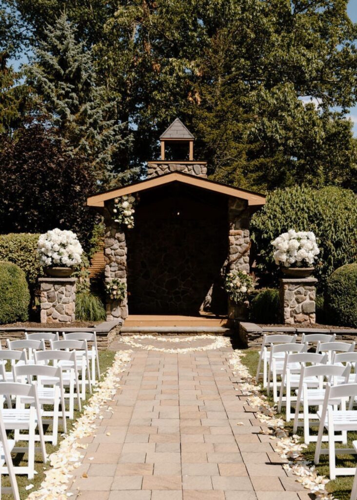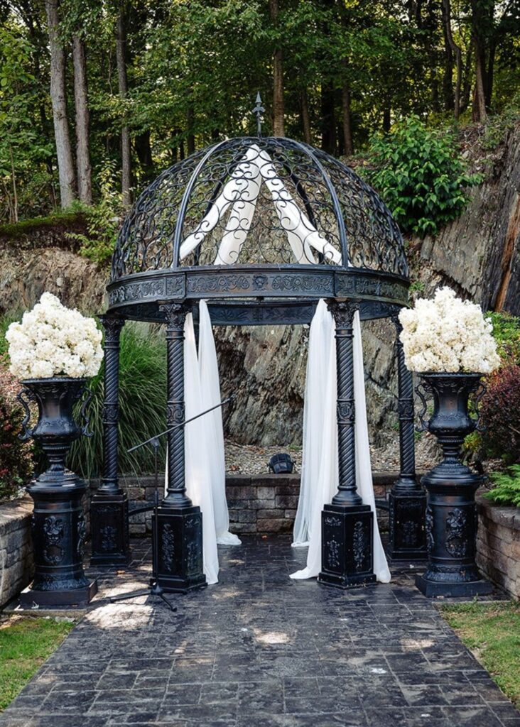 Lawnhaven’s Evergreen Garden is an ideal ceremony site, featuring a stone gazebo, fire columns, and a three-tier water feature.