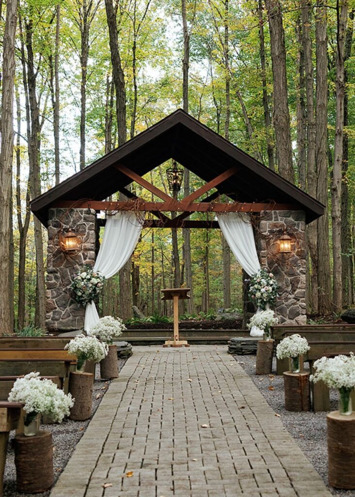 The Woodland Chapel is nestled among oak and maple trees, with a path leading to a fieldstone and gazebo near a charming waterfall.